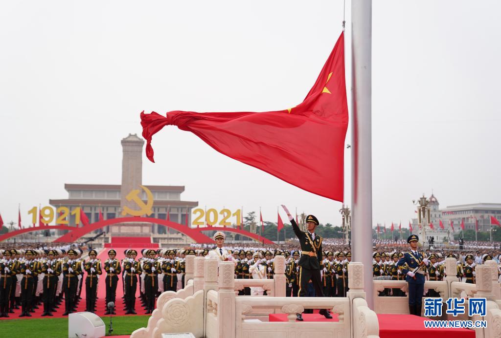7月1日上午,庆祝中国共产党成立100周年大会在北京天安门广场隆重举行。这是升国旗仪式。