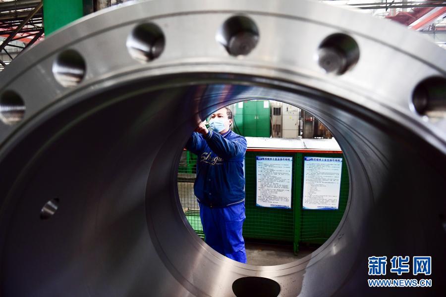 2020年2月10日,沈阳鼓风机集团股份有限公司工人在生产线上工作。新华社发(沈鼓集团提供)