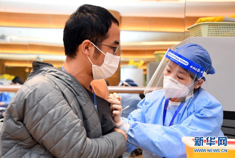2月22日,在北京市海淀区中关村软件园二期一家企业内的临时接种点,医务人员为企业员工接种新冠疫苗。新华社记者 任超 摄