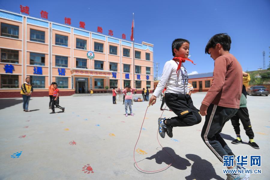 2020年5月29日,甘肃省临夏回族自治州东乡族自治县龙泉镇拱北湾小学学生马有苏夫(前左)和同学跳绳。新华社记者 马希平 摄