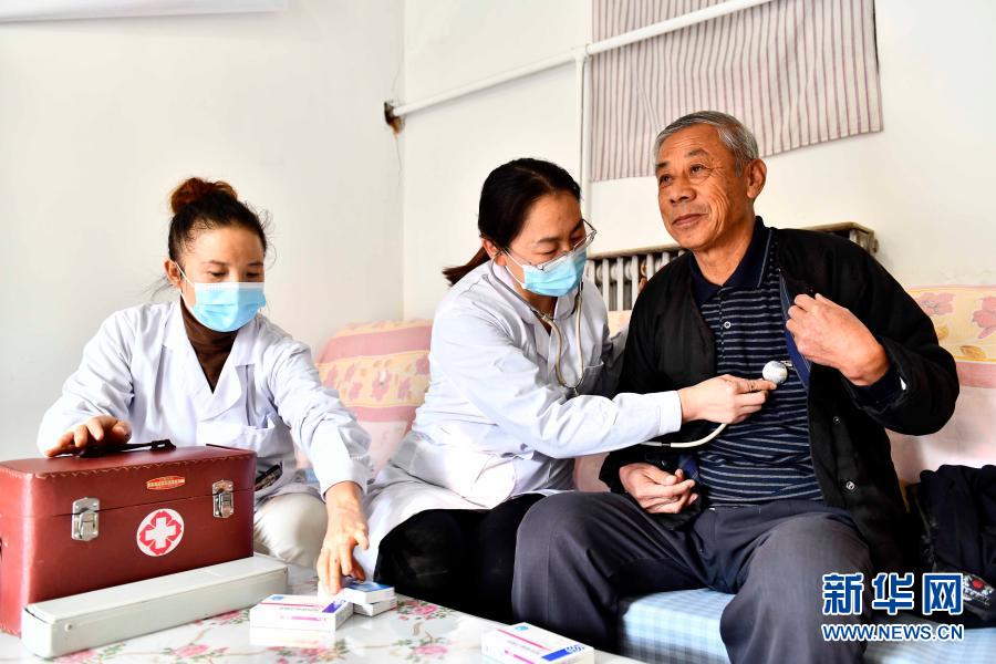 2020年11月11日,在山东省潍坊市寒亭区寒亭街道东院社区,卫生室医生王红霞(中)为村民张勇臣看病。寒亭区探索实施医保服务下沉举措,构建起覆盖全区基层医疗机构的医保服务下沉网络,让群众在家门口便捷地享受医保红利。新华社记者 郭绪雷 摄