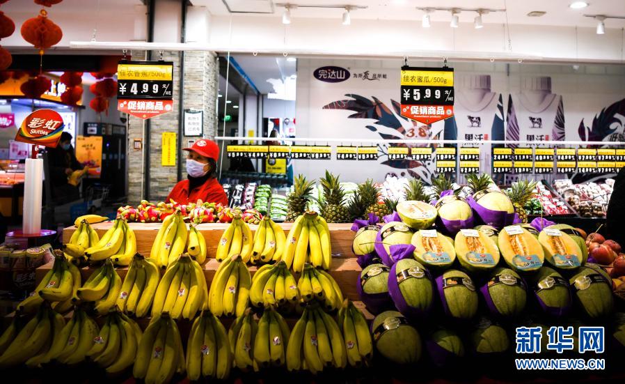1月25日,工作人员在哈尔滨市香坊区一家大型连锁超市摆放水果。