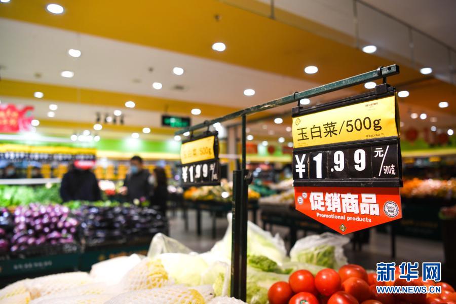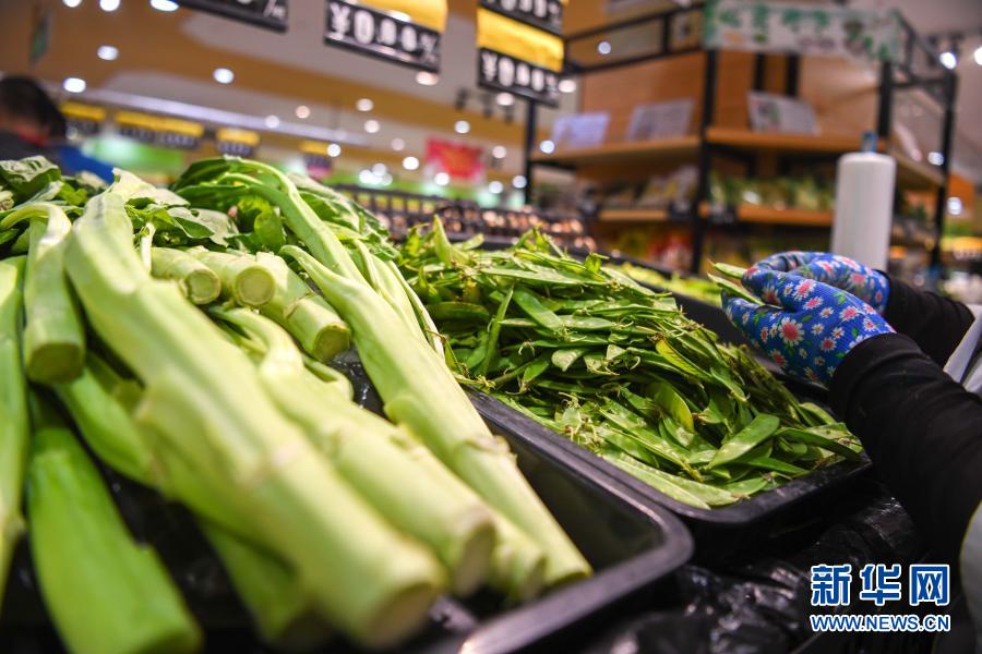 1月25日,工作人员在哈尔滨市香坊区一家大型连锁超市摆放菜品。