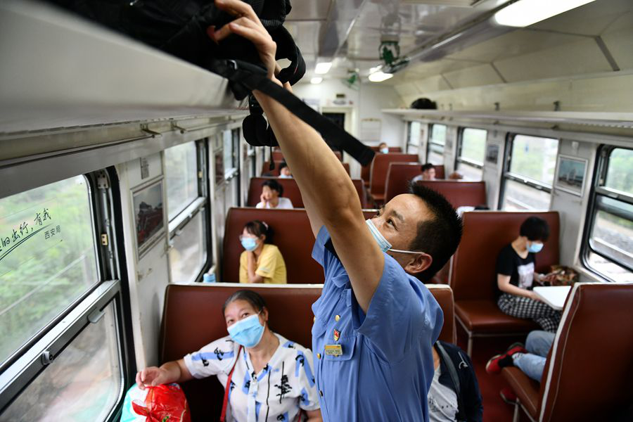 列车长修宝成整理行李架,确保旅客安全。(8月22日摄)