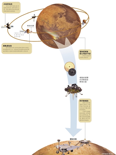 2月10日,“天问一号”火星探测器顺利实施近火制动,完成火星捕获,正式踏入环火轨道。计划于2021年5月至6月择机实施火星着陆,开展巡视探测。