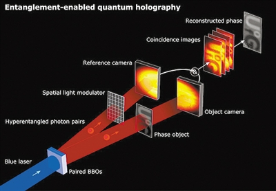 同时,相当于参考光束的另一束纠缠光子流撞击一个空间光调制器。空间光调制器是一种可部分减慢通过它们的光速的光学设备。一旦光子通过了调制器,与探测目标物体的纠缠光子流相比,其相位就有了不同。