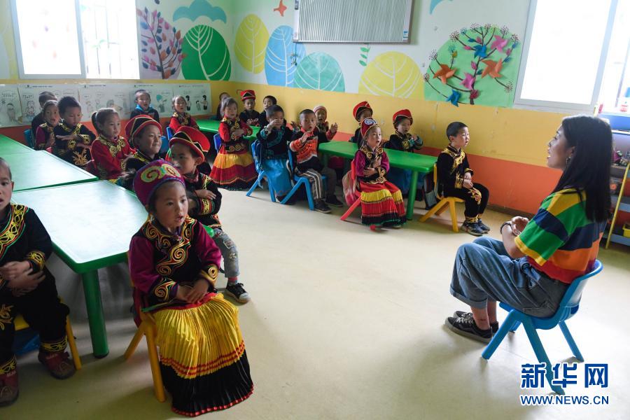 在四川省雷波县莫红乡三峡新村幼儿园,老师教孩子们用普通话唱歌(2019年5月14日摄)。新华社记者 江宏景 摄