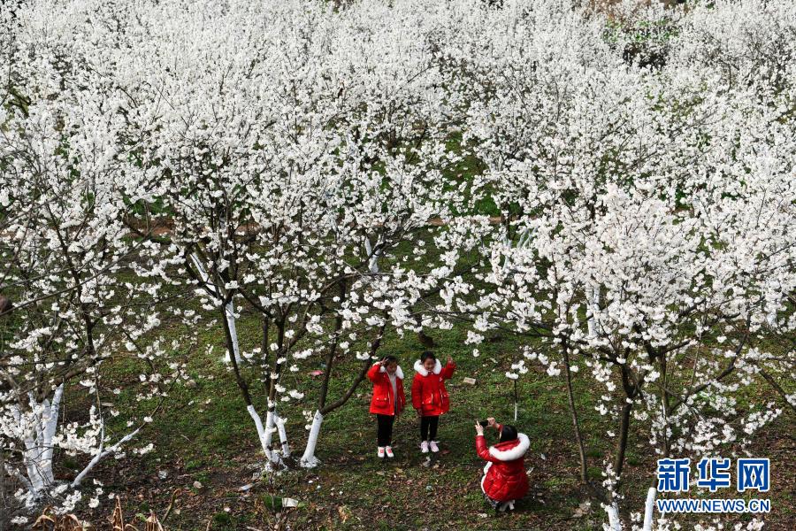 游客在贵州省黔西县新仁苗族乡化屋村的樱桃树下留影(2月19日摄)。新华社记者 杨文斌 摄