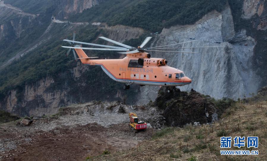 米-26重型直升机吊运一台挖掘机抵达四川省布拖县阿布洛哈村上空准备降落(2019年12月5日摄)。为了打通四川省布拖县阿布洛哈通村公路,施工单位租用的一架米-26重型直升机克服高山峡谷、天气多变等不利因素,从布拖县城吊运大型施工设备到阿布洛哈村,为两边分头掘进施工提供大型机械保障。新华社记者 江宏景 摄