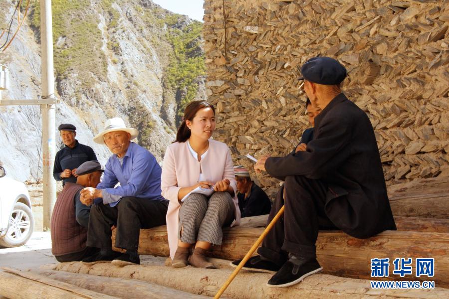 甘肃省甘南藏族自治州舟曲县扶贫办副主任张小娟(右二)在下乡时向群众了解情况(2018年4月摄)。2019年10月7日,时任县扶贫办副主任的张小娟在完成曲告纳镇上大年村脱贫攻坚县级抽样调查工作后,返程途中所乘车辆不慎坠江,因公殉职。新华社发