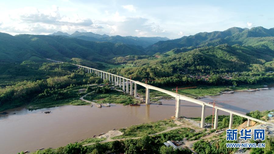 这是2020年7月15日拍摄的中老铁路班纳汉湄公河特大桥(无人机照片)。新华社发(中铁八局供图)