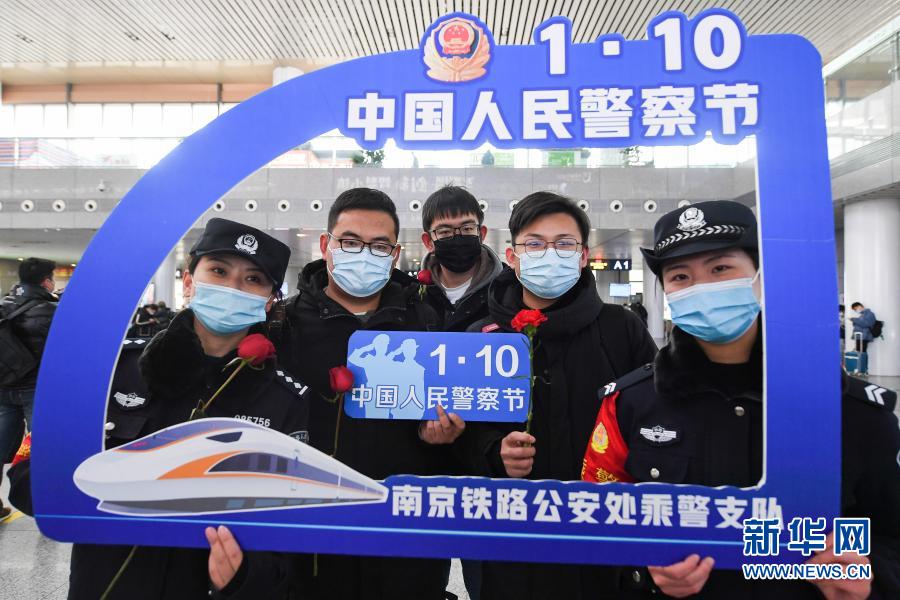 在南京南站候车大厅,民警和旅客合影,共迎“中国人民警察节”(2021年1月7日摄)。新华社记者 季春鹏 摄