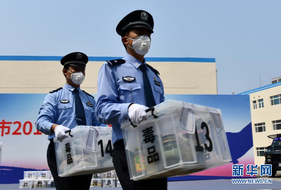 在天津市2019年集中销毁毒品活动现场,警察将毒品搬送到销毁炉处(2019年6月26日摄)。新华社记者 李然 摄