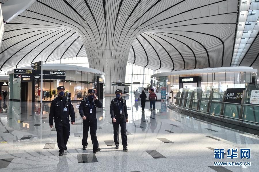 北京大兴机场民警在航站楼里执勤(2020年2月1日摄)。新华社记者 彭子洋 摄