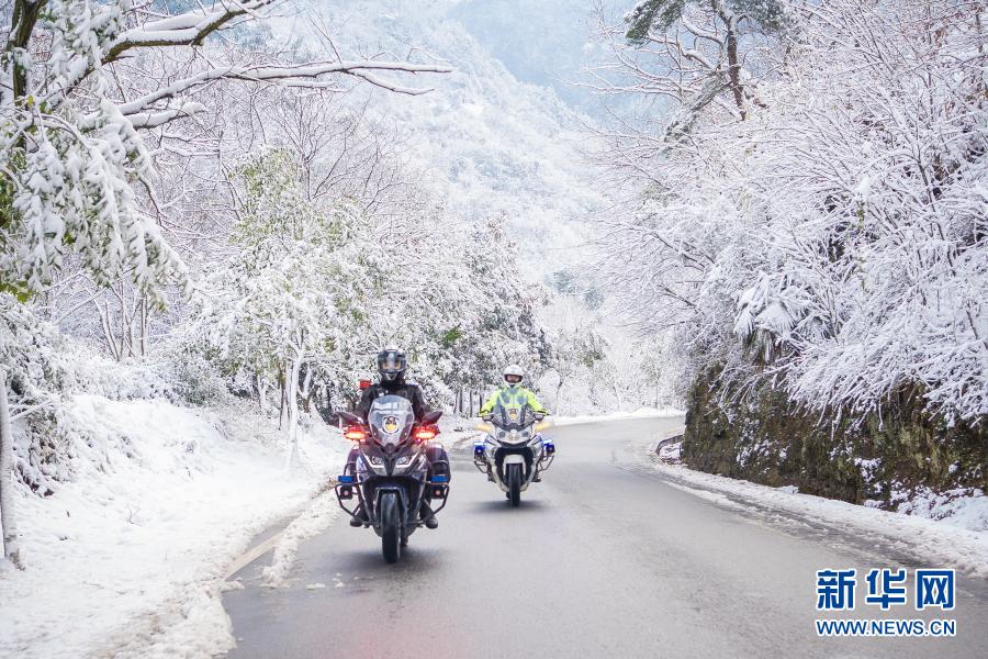 浙江省绍兴市新昌县公安局铁骑中队民警在儒岙镇会墅岭路段巡逻,提醒过往车辆雪后减速慢行(2020年12月15日摄)。新华社发