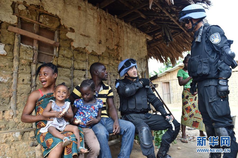 中国维和警察防暴队队员在利比里亚格林维尔的一座村庄询问当地治安等情况(2015年11月3日摄)。新华社记者 孙瑞博 摄