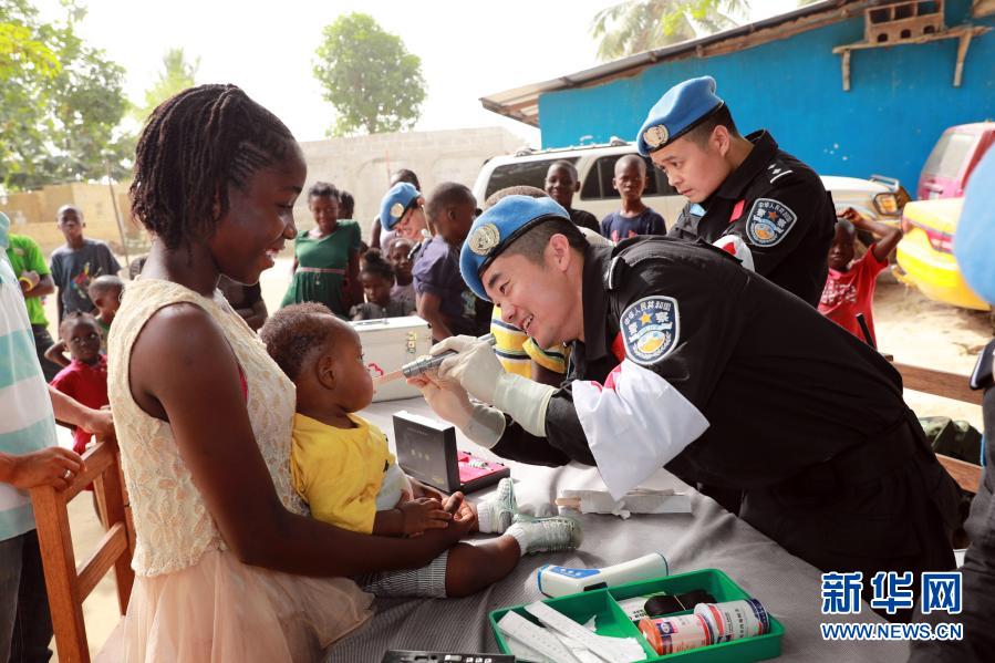 在利比里亚蒙罗维亚,中国第五支驻利比里亚维和警察防暴队医护人员为本森威尔社区孤儿院的儿童和员工进行义诊(2017年12月28日摄)。新华社发(赵小新 摄)