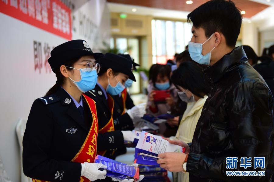 新疆乌鲁木齐市公安局天山区分局开展“一心为民110,砥砺奋进新征程”宣传活动,这是民警向市民介绍报警流程(2021年1月6日摄)。新华社记者 侯昭康 摄
