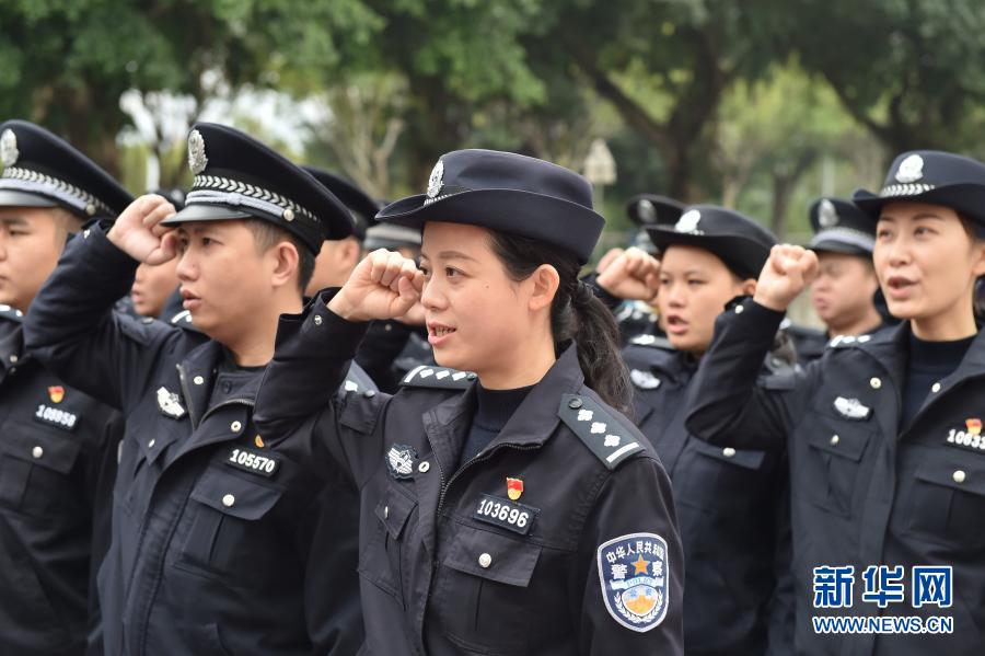 在广西南宁市公安局青秀分局中山派出所,民警在重温入警誓词(2021年1月6日摄)。新华社记者 刘岭逸 摄