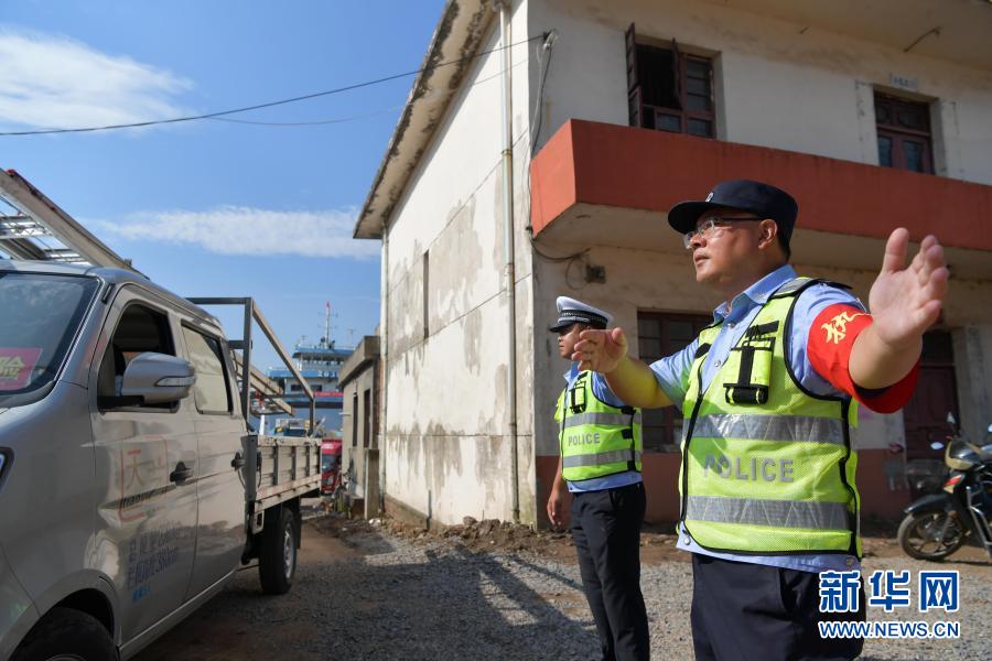 江西省彭泽县棉船镇棉船派出所的梅玉胜(右)在渡口指挥疏导上下车辆(2020年7月22日摄)。新华社记者 彭昭之 摄