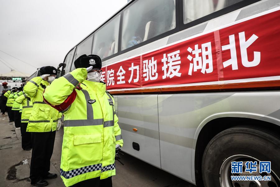 沈阳市公安局交通警察局浑南大队民警在沈丹高速沈阳站为辽宁省第二批对口支援湖北襄阳医疗队送行(2020年2月14日摄)。新华社记者 潘昱龙 摄