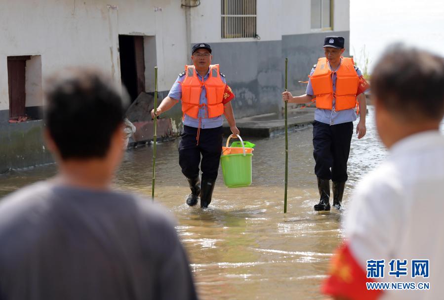 江西省彭泽县棉船镇棉船派出所的梅玉胜(左二)和同事帮助一名家中进水的居民拿取生活必需品(2020年7月22日摄)。新华社记者 彭昭之 摄