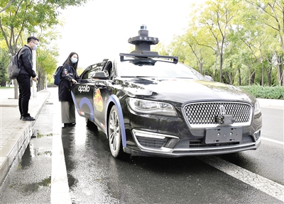 市民在北京市海淀区稻香湖路的百度自动驾驶出租车指定上车点乘车。记者 任超 摄