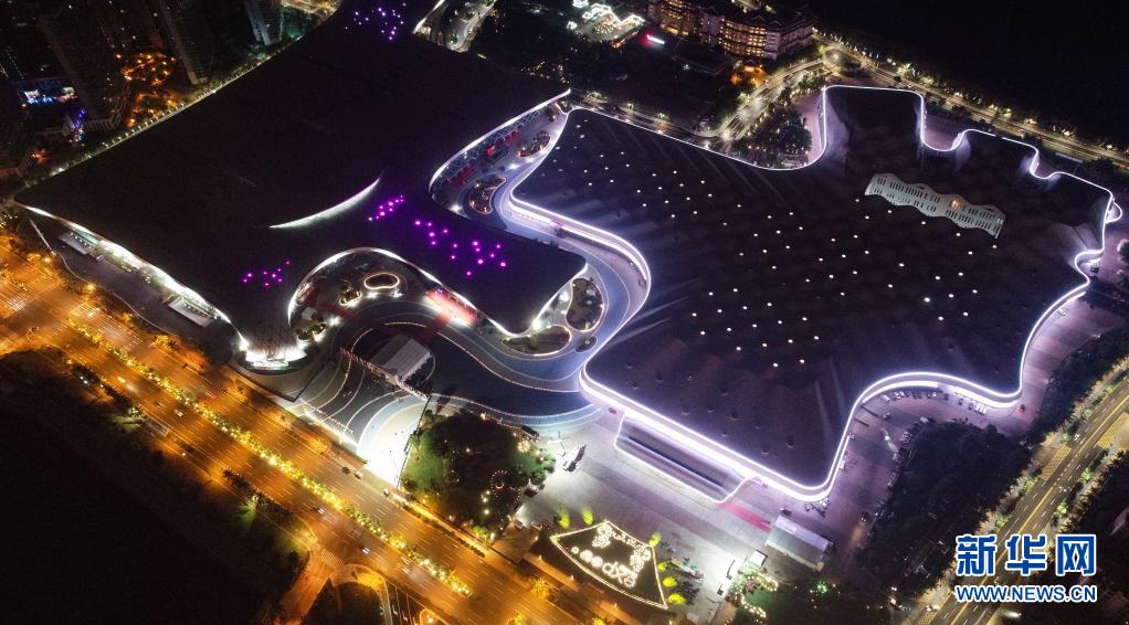 夜色下的首届消博会举办地海南国际会展中心(无人机照片,5月4日摄)。新华社记者 杨冠宇 摄
