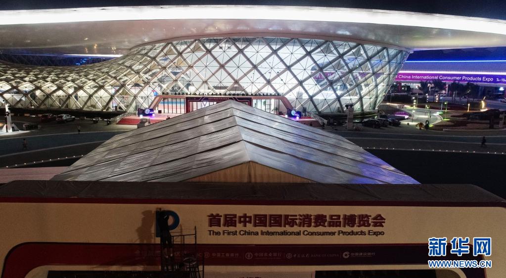 在首届消博会举办地海南国际会展中心,工作人员在加班忙碌(无人机照片,5月4日摄)。新华社记者 杨冠宇 摄