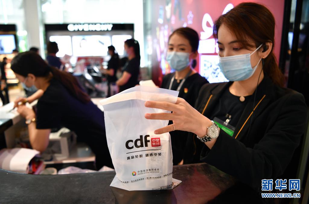 店员在海南博鳌免税店为消费者打包(4月19日摄)。新华社记者 郭程 摄