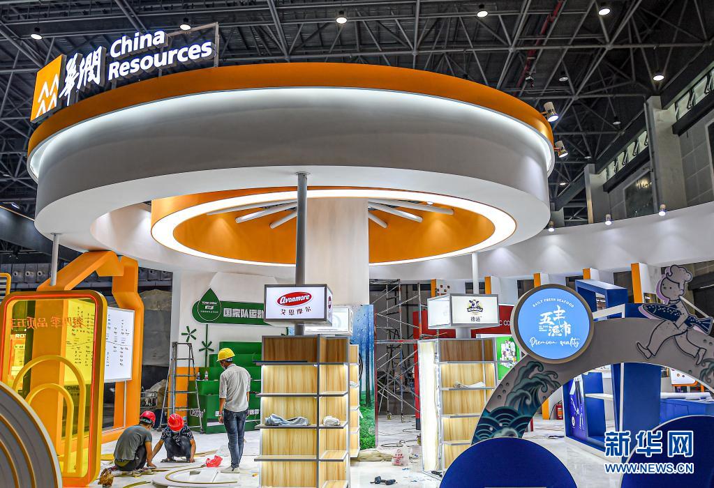 5月1日,工人在位于海口的海南国际会展中心消博会展台施工。新华社记者 蒲晓旭 摄